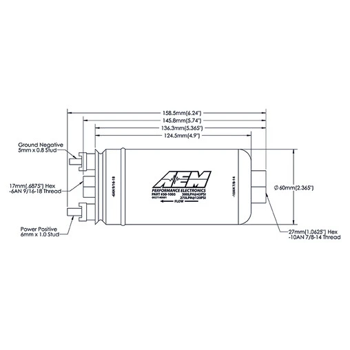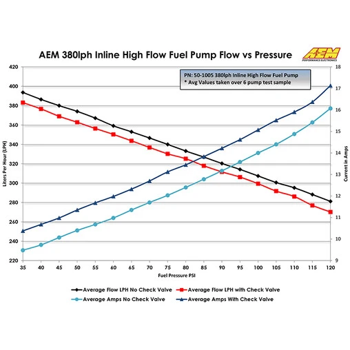 This pump has been designed by AEM for highly tuned vehicles that require a high fuel flow and pressure, as well as incredible reliability. Made in the USA, it features a “044” design and can be used in-tank or externally. Its flow can reach up to 400 lph at 3 bars, 340 lph at 5 bars, 270 lph at 8 bars (see chart above).