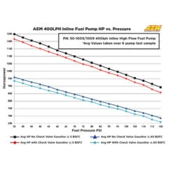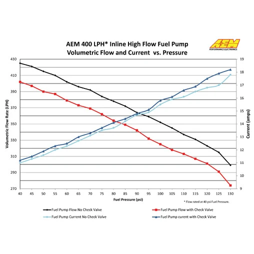 This pump has been designed by AEM for highly tuned vehicles that require a high fuel flow and pressure, as well as incredible reliability. Made in the USA, it features a “044” design and can be used in-tank or externally. Its flow can reach up to 400 lph at 3 bars, 340 lph at 5 bars, 270 lph at 8 bars (see chart above).