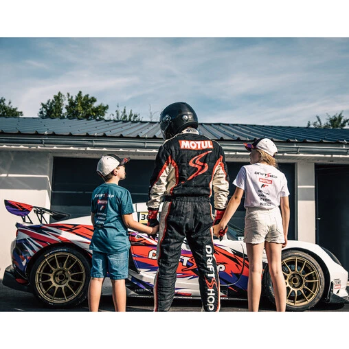 Wear DriftShop’s colors with this blue t-shirt, children sizes, featuring our S15 and the logos of our beloved partners.