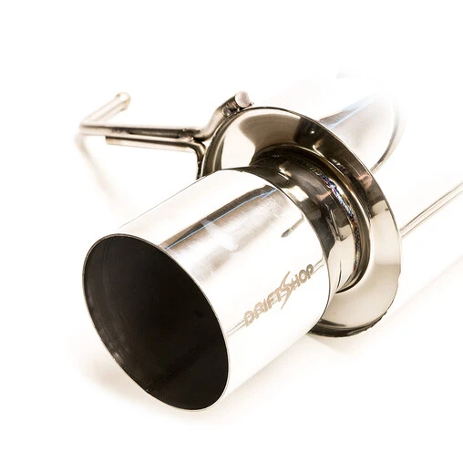 A “catback” exhaust system means all components located after the catalytic converter. This DriftShop catback is a 3″ (76mm), T304 stainless steel system, with a silenced back box including a 4″ tip.