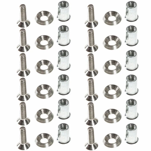This installation kit made from stainless steel includes 12 inserts, 12 washers and 12 screws. Its sophisticated design allows you to install your fender flares with a professional finish, reliable and strong, all while making the flares easy to attach and remove (compared to an installation with rivets).