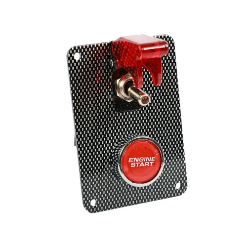 The panel has a striking carbon-effect finish and incorporates a main switch with indicator light protected by an aircraft-style cap, plus a red engine start button. Pre-assembled, it comes with a 12V 40A relay and a universal wiring harness.