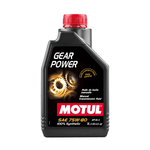 Motul Gear Power 75W80 high performance transmission oil has been specially formulated for manual gearboxes of recent vehicles requiring low viscosity fluid. It is indicated in all conditions of street or racing use. Its 100% synthetic composition offers maximum protection to your gears: high lubricating power, stable viscosity, optimal cooling and long life.
