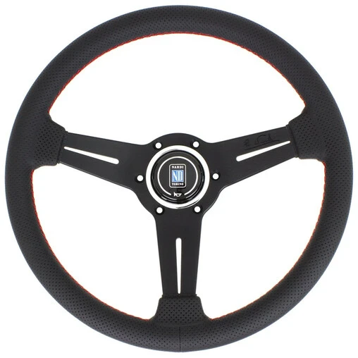 Nardi Classic ND33 Steering Wheel, Black Perforated Leather, Black Spokes, Red Stitching, 25 mm Dish Specifications