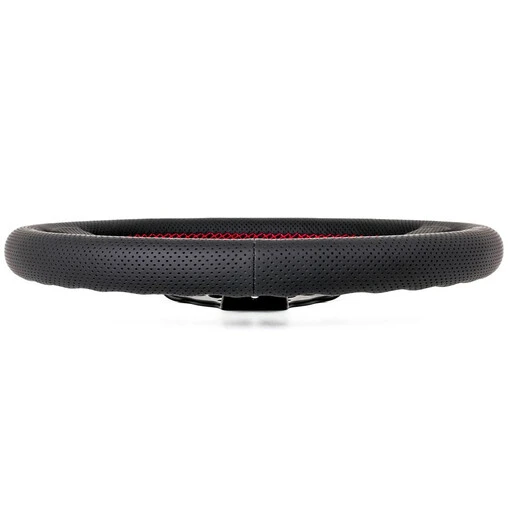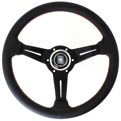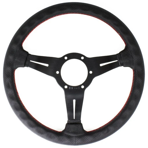 Nardi Deep Corn Steering Wheel, Black Perforated Leather, Black Spokes, Red Stitching, 35 mm Dish, Ø33 cm Specifications